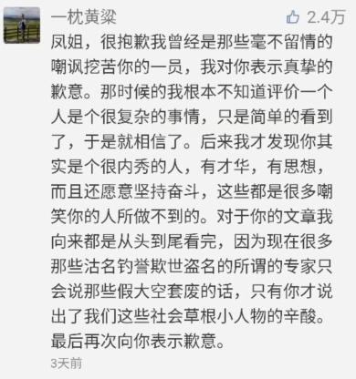 正如凤姐自己说的,她去美国是跟自己的命运抗争,她要拿到绿卡,证明自己也是和别人一样优秀。骂她的人们错了。文章一发出来很多人深深的感动了,人们突然发现自己错了错的很离谱。我们不何尝是一个底层人物,但是我们不敢于去和命运抗争,甚至怒骂像凤姐这样不甘于命运的人。在凤姐的这篇文章发出来之后。有一些网友在留言上对凤姐道歉并祝福。如下图