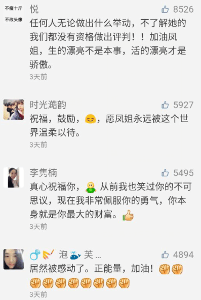 看到这里深深的被凤姐感动了,我从来没有想到过她是这样的一个人,她竟然是这样的人。原来蕴育在那个女孩的身体里是这样的善良。我同时也要反思自己这些年的事情。我骂过凤姐,说她不要脸。当初也不知道为什么要骂她。看到别人骂,我也骂。虽然凤姐从来没有得罪过我。但我还是骂了,我跟随主流网友的观点破口大骂,说世上怎么有这样不要脸的女子。从来没有想到我也是伤害凤姐的一份子,伤害了一个敢于向命运抗争的女孩。