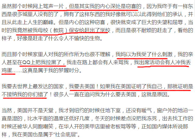 凤姐一直想和城里的孩子一样,过上他们那样的生活,她没有错,错的是我,我当年看不懂骂了凤姐。凤姐通过这几年的努力,现在差不多也过上了她想要的生活。她做过凤凰主笔,做过天使投资人,她期望拿到美国绿卡,证明自己。