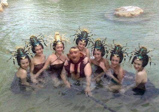 在西游记蜘蛛精一段,里面说唐僧去化斋,看到七个漂亮的妹子(蜘蛛精),然后跑去化斋(讨点吃的),结果被蜘蛛精给抓了。孙悟空一看师傅化斋半天没回来就去找,然后在濯垢泉就看见了蜘蛛精洗澡香艳一幕。