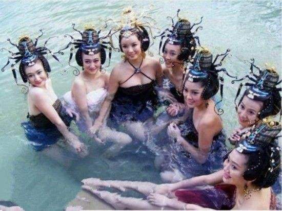 原文: 那浴池约有五丈余阔,十丈多长,内有四尺深浅,但见水清彻底。底下水一似滚珠泛玉,骨都都冒将上来,四面有六七个孔窍通流。流去二三里之遥,淌到田里,还是温水。池上又有三间亭子,亭子中近后壁放着一张八只脚的板凳。两山头放着两个描金彩漆的衣架。行者暗中喜嘤嘤的,一翅飞在那衣架头上钉住。那些女子见水又清又热,便要洗浴,即一齐脱了衣服,搭在衣架上。一齐下去,被行者看见——