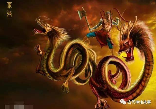 水神共工。蟒头人身,踏黑龙,缠青蛇;善操纵洪荒水势,号称水神,掌控洪水。在中国古代奇书《山海经》中记载,共工与颛顼争夺帝位没有成功而愤怒的撞向天柱不周之山。